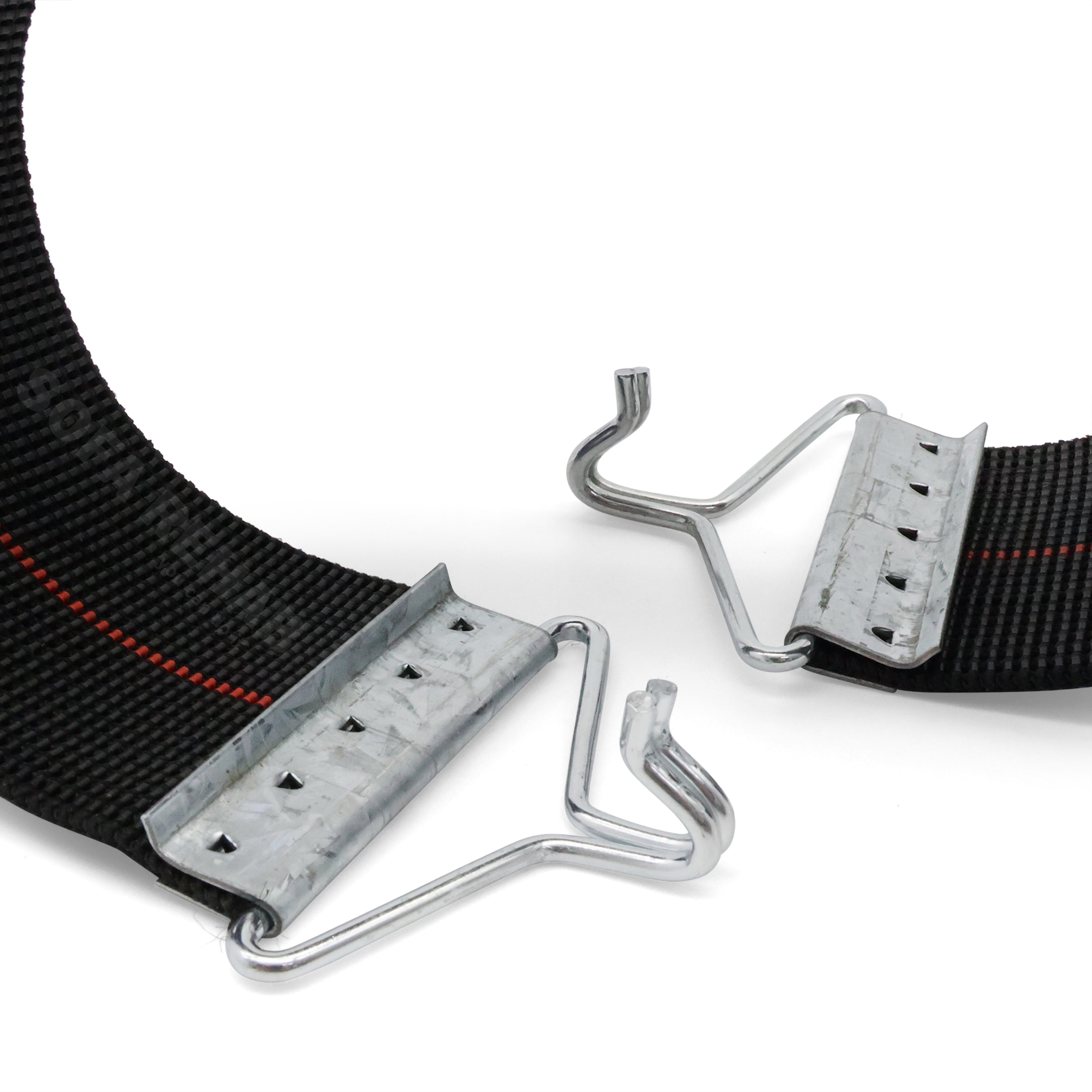 Each length of webbing requires two hooks – one on each end. Both hooks must face the same direction so they slot correctly into the metal frame holes.