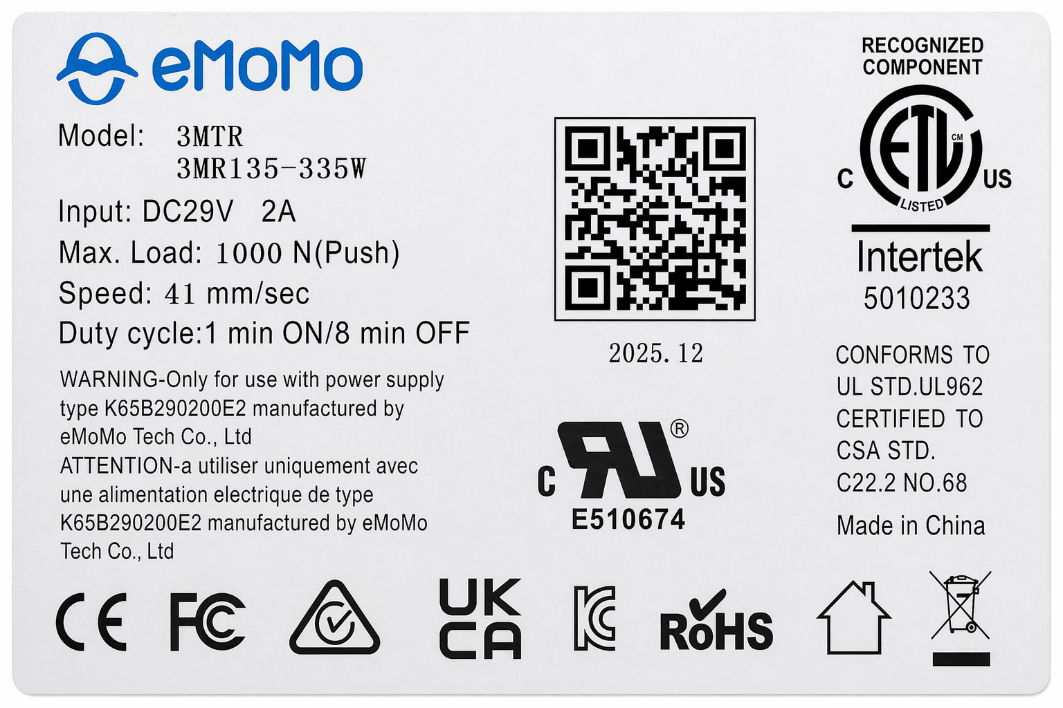 The eMoMo Tech 3MTR 3MR135-335W actuator is a complete replacement motor designed to restore smooth operation to electric recliner chairs, sofas, and lift chairs. Operating on DC29V 2A power, this actuator delivers reliable performance with a 1000N push load capacity and a movement speed of 41mm per second.