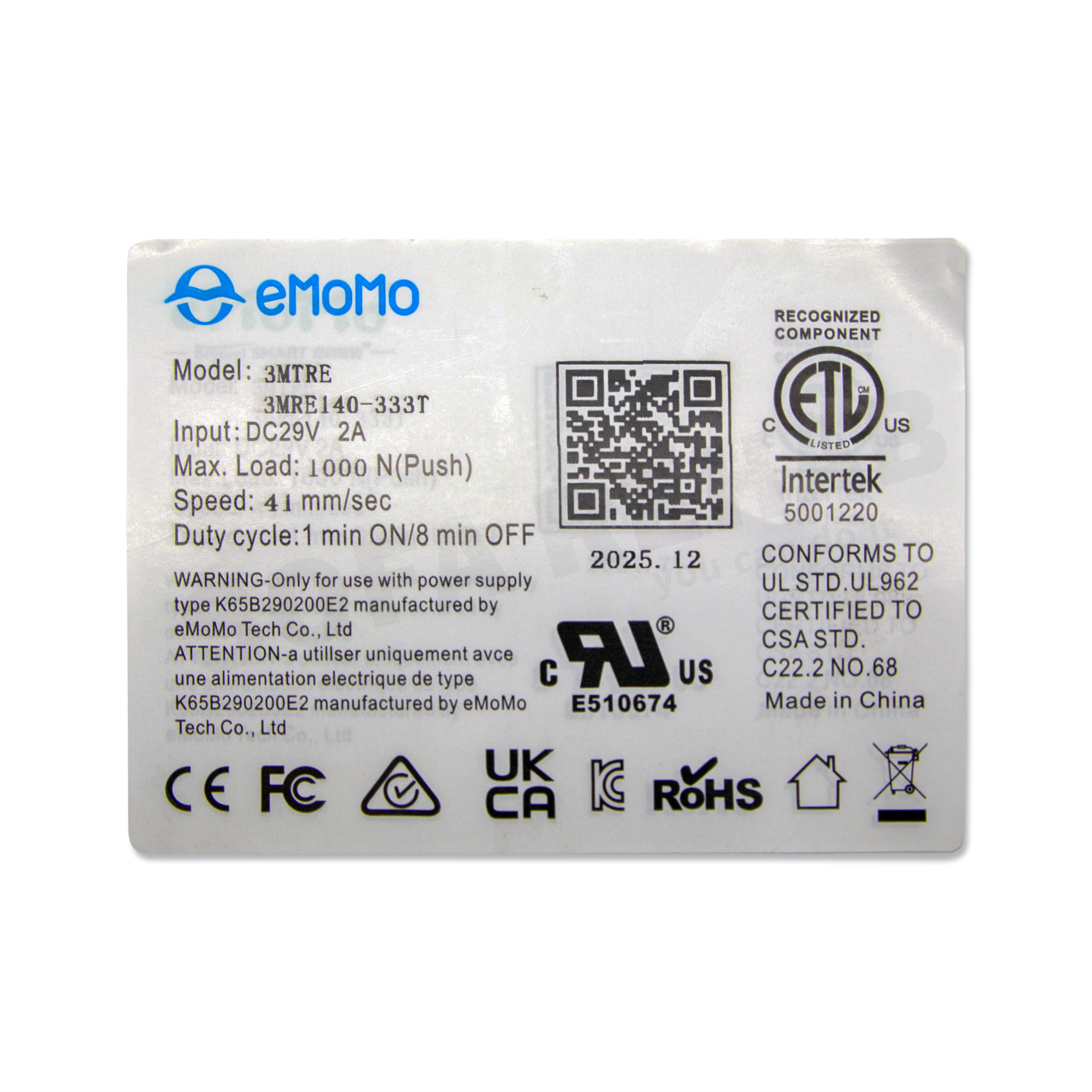 • eMoMo-tech-actuator-3MTRE-3MRE140-333T-specification-label-29v-2a-1000n
